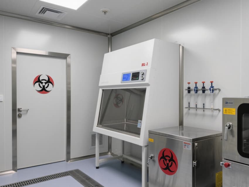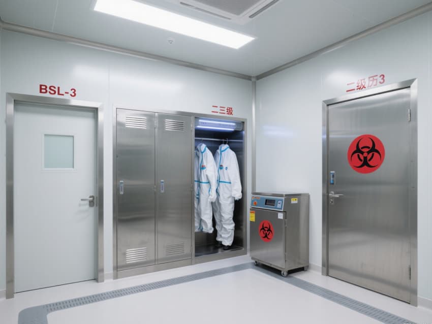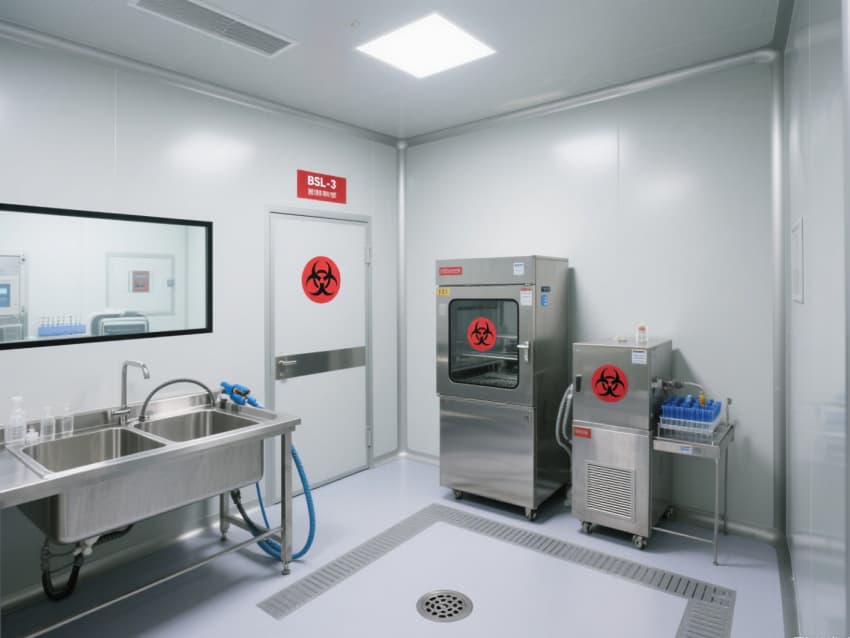 病原微生物實(shí)驗(yàn)室是開(kāi)展危險(xiǎn)微生物研究的核心場(chǎng)所,嚴(yán)格遵循BSL-2/3級(jí)生物安全標(biāo)準(zhǔn),構(gòu)建多層防護(hù)體系。整體以灰白色抗菌彩鋼板打造密閉墻體與吊頂,搭配淺灰色防滑防腐地坪,墻面紅色生物危害標(biāo)識(shí)與藍(lán)色功能分區(qū)線(xiàn)清晰劃分,強(qiáng)化安全警示與流程引導(dǎo)。?