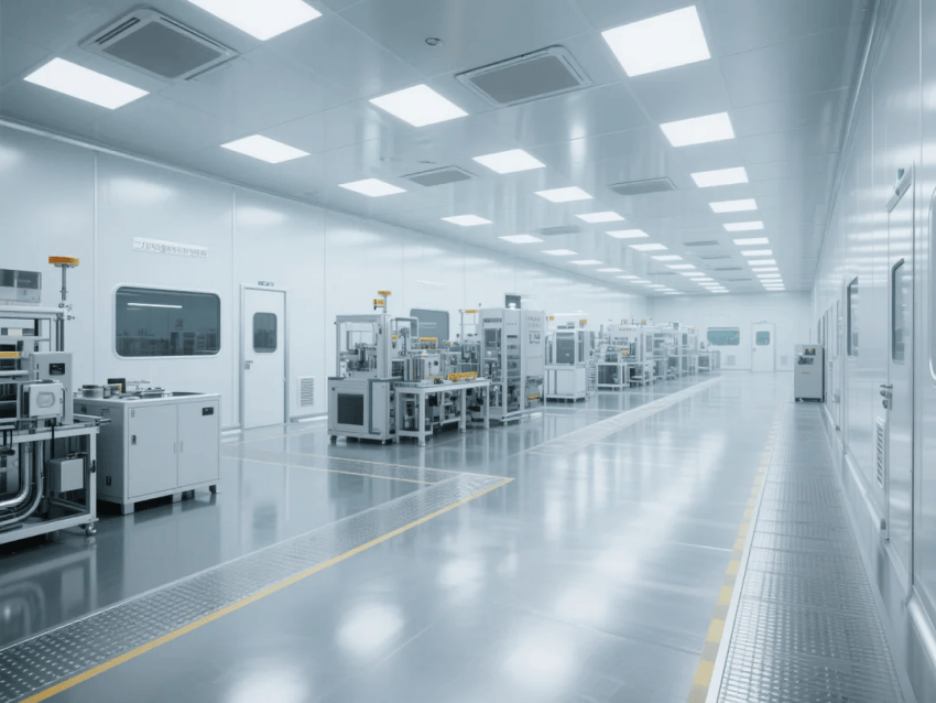智能化配置:集成環境監測與設備聯動系統,白色彩鋼板墻面嵌裝LED智能看板,實時顯示生產數據與潔凈參數。機械臂工作站配備藍光定位系統,與金屬灰地坪形成科技視覺呼應。