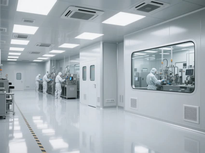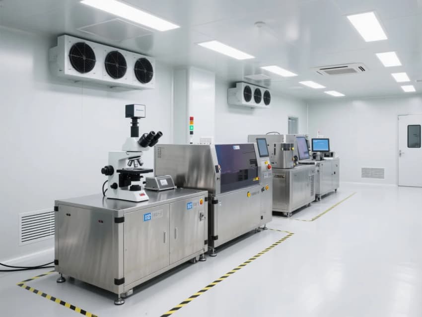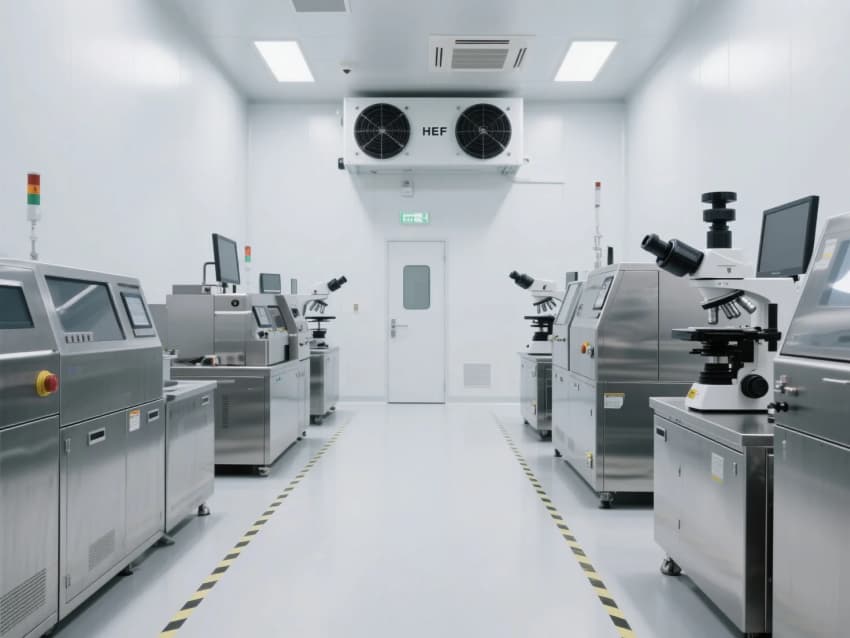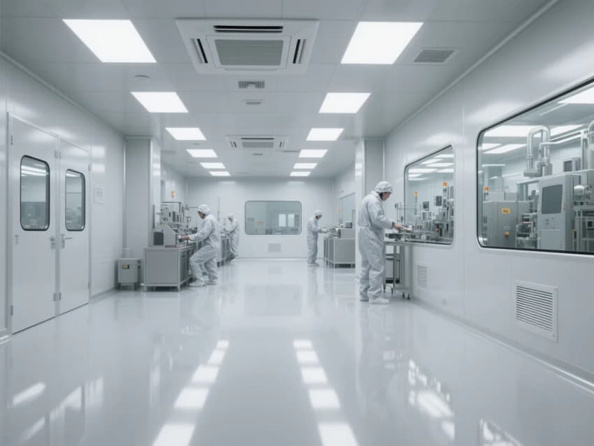 本方案采用"科技極簡主義"風(fēng)格,以ISO 5級(萬級)潔凈標(biāo)準(zhǔn)為核心。空間設(shè)計(jì)強(qiáng)調(diào)線性流動感,灰白主色調(diào)搭配防靜電環(huán)氧樹脂地坪,墻面采用抗菌彩鋼板。頂棚網(wǎng)格化FFU送風(fēng)單元配合側(cè)墻回風(fēng),形成垂直層流。功能分區(qū)明確,包含更衣緩沖間(Class 7)、核心生產(chǎn)區(qū)(Class 5)、設(shè)備維護(hù)通道。智能控制系統(tǒng)集成溫濕度(22±1℃/45±5%)、壓差(+10Pa)、粒子監(jiān)測顯示。創(chuàng)新采用LED黃光照明減少光致氧化,設(shè)備基座增設(shè)主動減震系統(tǒng)。設(shè)計(jì)融合人機(jī)工程學(xué),防靜電設(shè)施覆蓋率100%,通過藍(lán)色光帶引導(dǎo)潔凈動線,實(shí)現(xiàn)功能性與未來感的完美平衡。