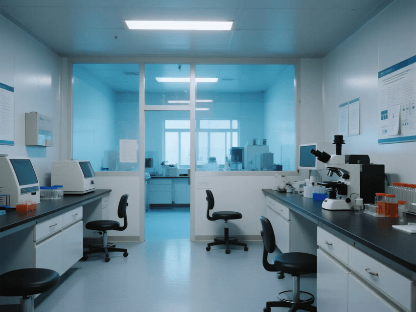 本實驗室以"科技藍調"為設計主題,嚴格遵循生物安全二級(BSL-2)及ISO14644-1標準,打造兼具專業性與美學體驗的分子生物學研究空間。整體采用深海藍與鈦白灰的色彩組合,營造冷靜而富有科技感的實驗環境。