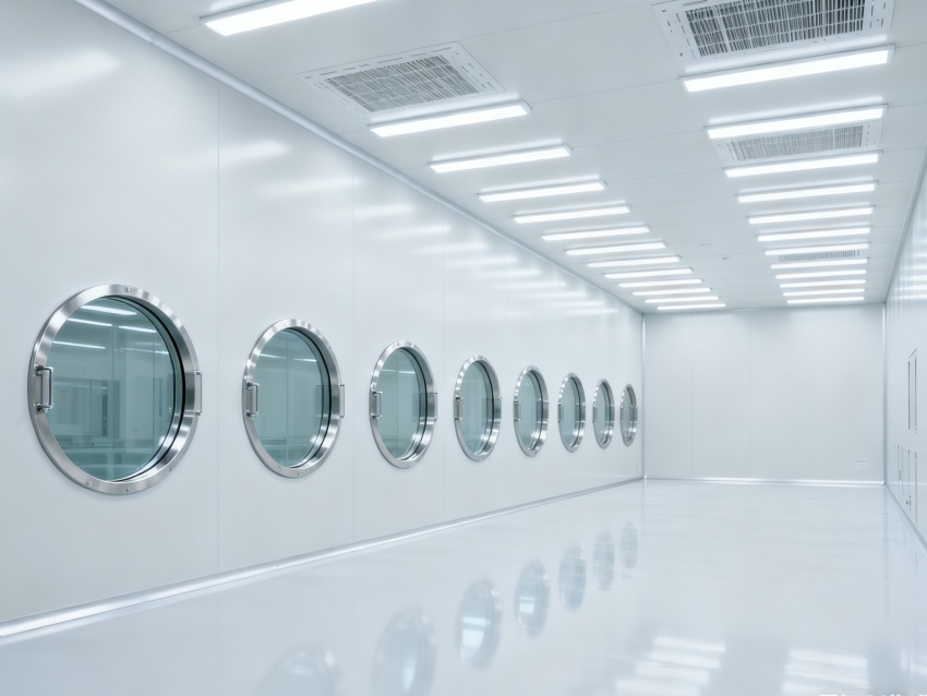 材料選用兼顧潔凈與維護:地面鋪設雙層環氧自流平,底層強化抗壓,面層抗污處理,常規清潔便捷;墻面采用卡扣式彩鋼板,支持單塊拆卸,降低維護成本;門窗配備氣密平移門、自動閉門器及密封膠條,隔絕外界污染。?